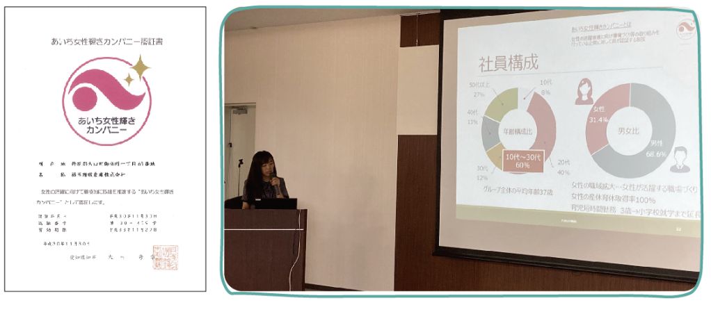 2018年11月に愛知県より「あいち女性輝きカンパニー」の認証を取得しました。現場では作業負荷を軽減し、安全な職場づくりを行うことで女性が働きやすい環境整備を進めています。また、従業員の育休後の時短勤務期間を法律で定められた期間よりも大幅に延長し、小学校就学まで(6歳)とするなど、出産後も長く仕事を続けられるよう取り組んでいます。さらに、女性の管理職を積極的に増やしキャリアアップを応援するなど、より女性の活躍の場を広げられる活動を行っています。