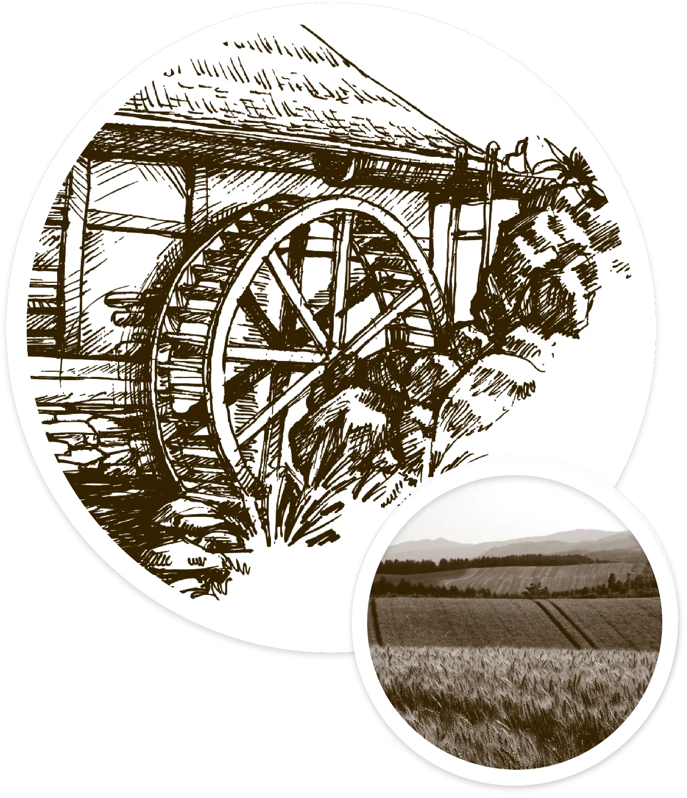 肥沃な濃尾平野を貫いて伊勢湾に注ぐ五条川の流れ、それが物語の最初の舞台でした。この川の恵みがもたらす豊かな穀物の実りを、流れが生み出す水力を利用して加工しようと、明治7年(1874)に水車工場を開始しました。